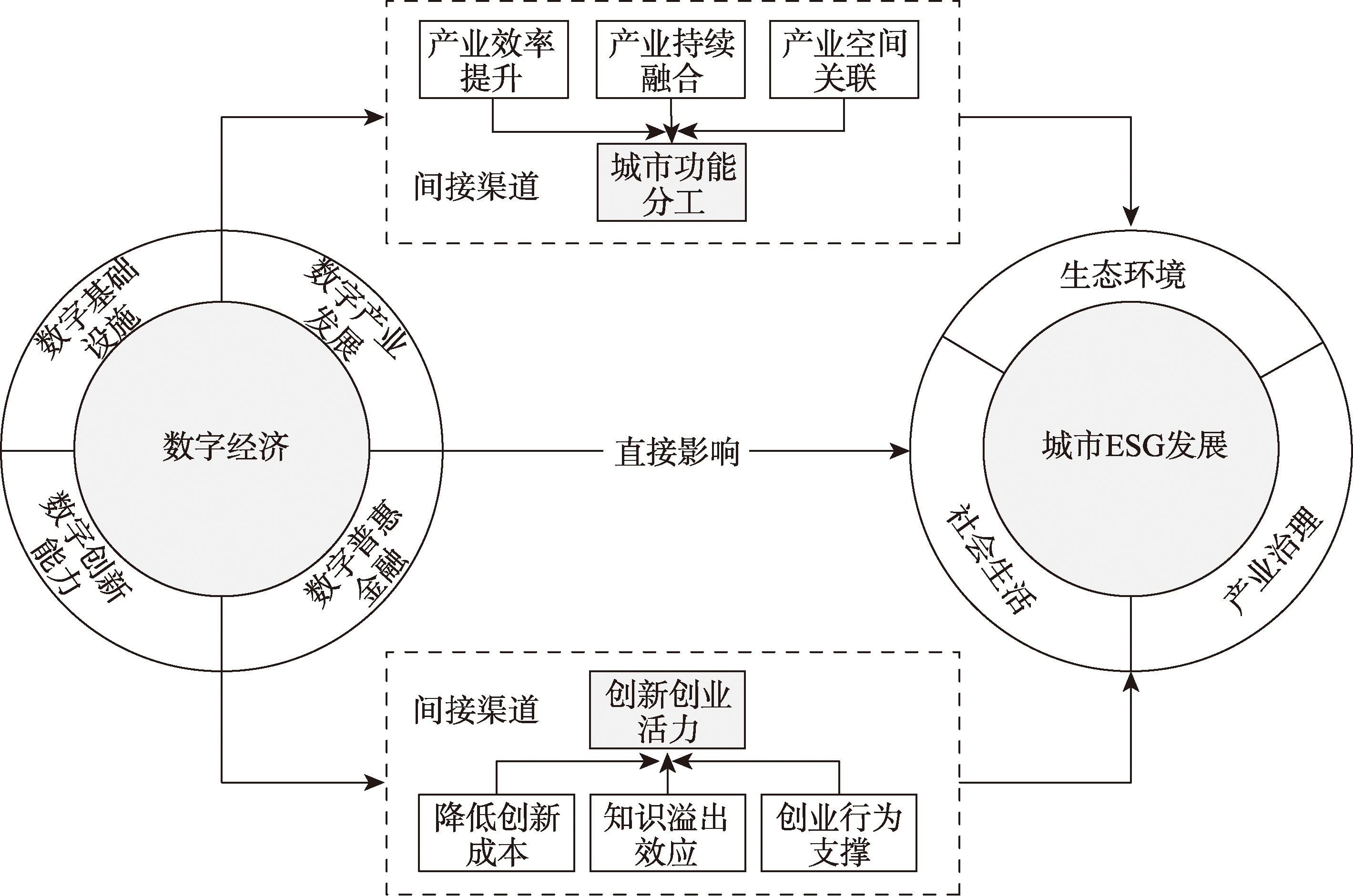 数字经济已成为推动城市可持续发展的重要动力。在生态环境(Environment)、社会生活(Society)、产业治理(Governance)视角下构建了城市ESG指标体系,并基于2011—2021年285个城市数据,探究城市ESG发展空间格局的演进特征,然后运用双重机器学习的研究方法分析数字经济对城市ESG发展的影响。结果发现:① 城市ESG发展的空间分布具有明显的地域差异特征,最终形成以城市群为载体的高水平集聚地。② 数字经济发展会正向提升以生态环境、社会生活、产业治理为内涵的城市ESG发展水平,该结论通过了多种稳健性检验。数字经济分维度而言,数字产业发展与数字创新能力为城市的ESG发展提供了重要的支撑和动力。③ 城市功能分工及创新创业活力是数字经济对城市ESG发展影响的重要渠道。此外,基于空间异质性检验发现,数字经济对东部、西部地区以及城市群区域的城市ESG发展的提升作用更明显。