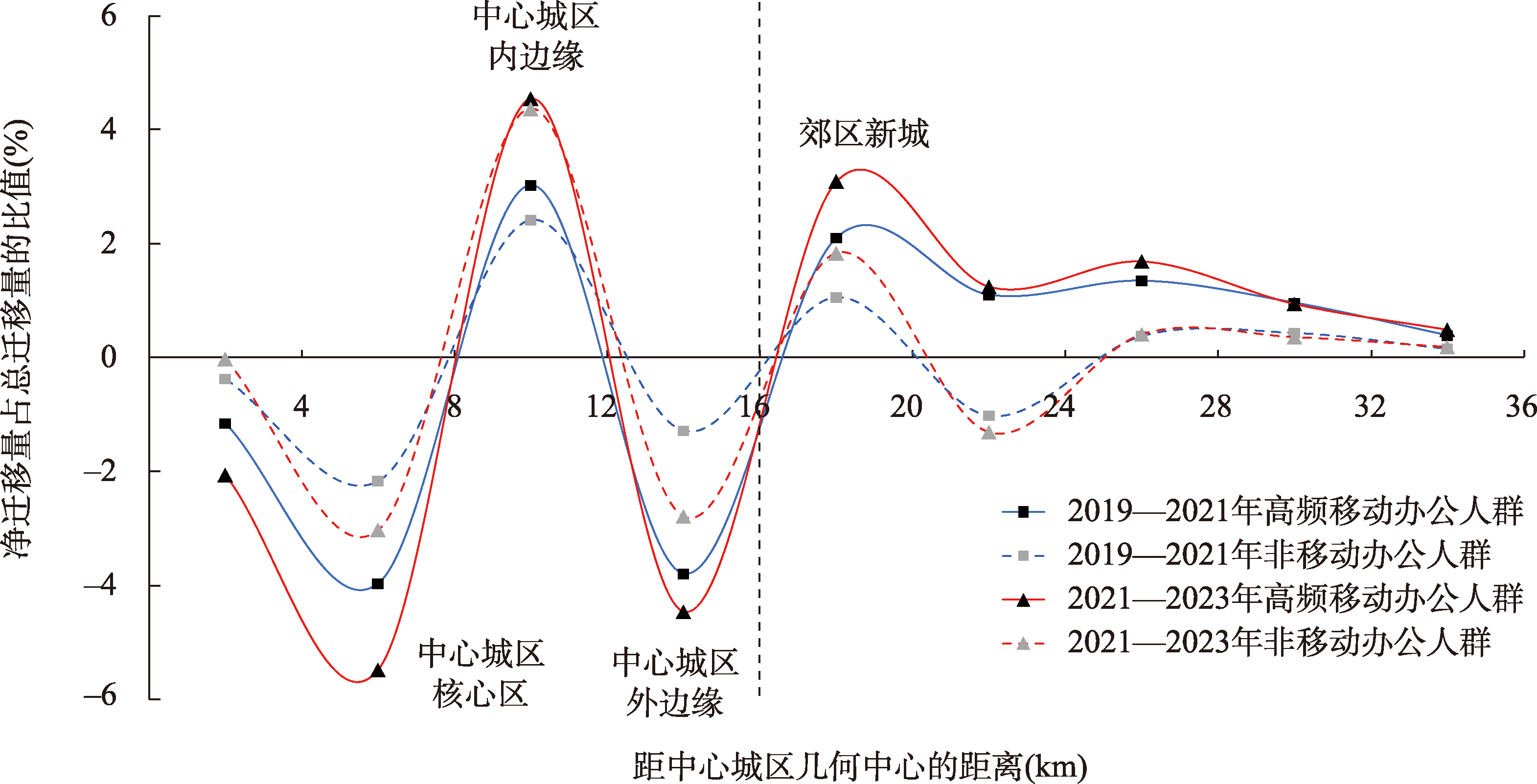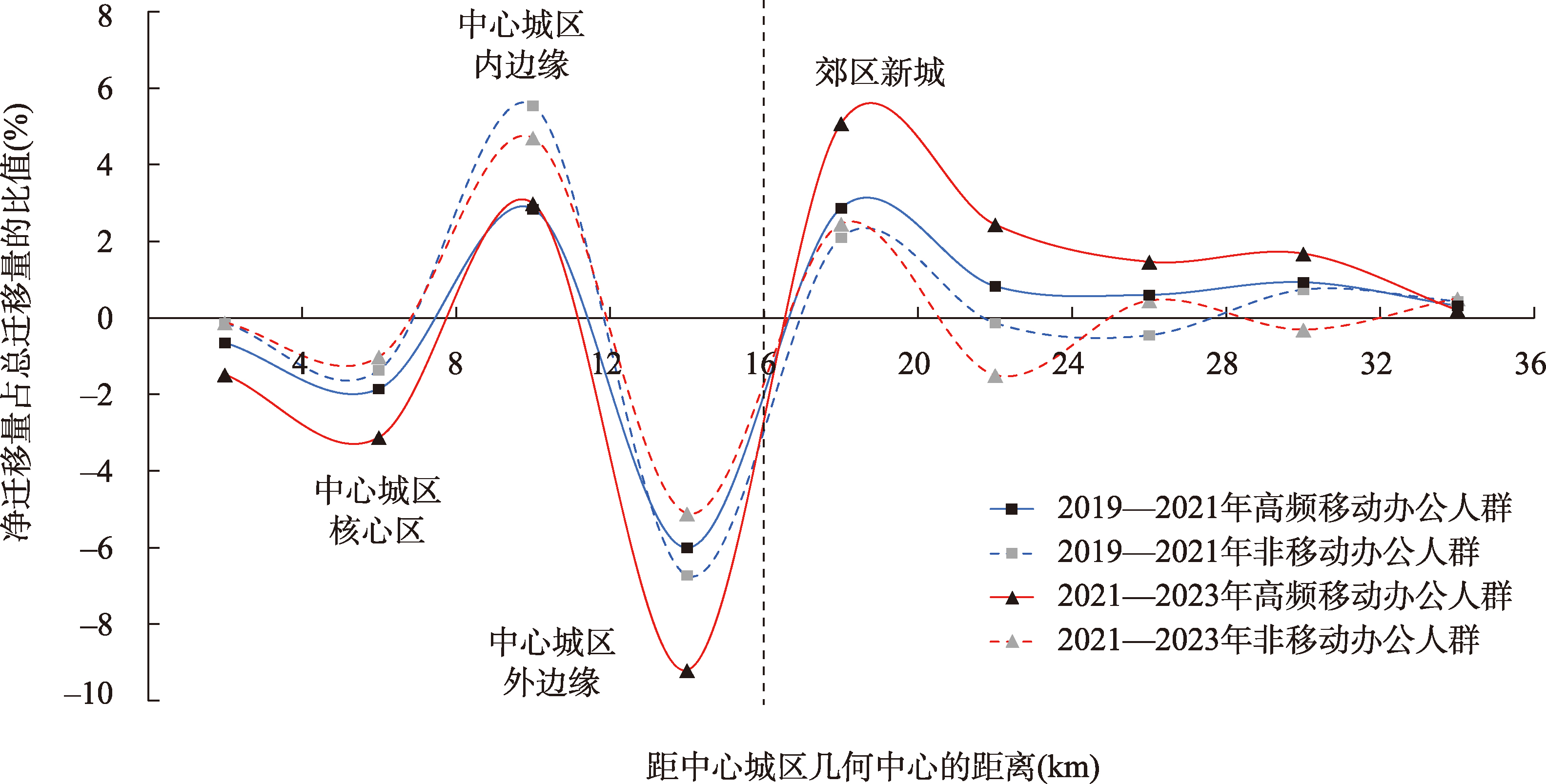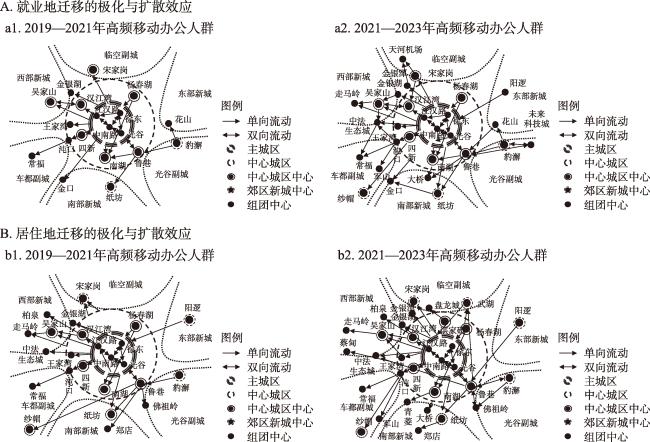 信通技术影响下的郊区化现象和格局演变一直是城市空间结构研究的热点话题。移动办公作为信通技术衍生出的新型办公生产活动,极大地提升了个体职住空间选择的灵活性和流动性,从而为解析城市郊区化现象与城市空间结构演变规律提供了新视角。基于时序手机信令大数据,构建2019—2021年、2021—2023年武汉市高频移动办公人群和非移动人群职住空间迁移数据库,综合对比分析、空间分析、社会网络分析等方法探究其职住空间郊区化的数量、空间、结构特征和演进趋势。研究发现:① 数量特征上,移动办公人群职住空间由中心城区向郊区新城迁移的人数和占比一定程度上高于非移动办公人群,其迁出数量更多且回迁相对更少,向郊区新城分散化的趋势在持续加强。② 空间特征上,移动办公人群职住空间由中心城区向郊区新城迁移的趋势较为明显,而非移动办公人群则主要在中心城区内部迁移的趋势更为明显。同时,移动办公人群在中心城区圈层内负向净迁移量更多,而在郊区新城内正向净迁移量更大。这表明移动办公人群迁向郊区的分散化趋势进一步强化。③ 结构特征上,移动办公人群在部分郊区新城中心的中心度隐有反超中心城区的趋势,且其中心度增幅已经高于三分之一的中心城区中心。此外,相较于就业空间,移动办公人群居住空间的分散程度更强、辐射范围更远,逐渐由中心城区向城郊结合地区-近郊区新城中心-接近远郊的组团中心扩散,这表明移动办公人群居住空间的选择进一步削弱了地理集聚效应。研究通过大数据实证发掘了信通技术影响下的城市空间及结构的郊区化演变趋势,丰富了信通技术对城市郊区化作用格局、过程的相关研究,也为解析城市的郊区化分散规律提供了移动办公这一新的理论视角,对信通技术发展新阶段下的城市郊区化现象、城-郊进一步融合协调和郊区新城可持续发展具有借鉴作用。
