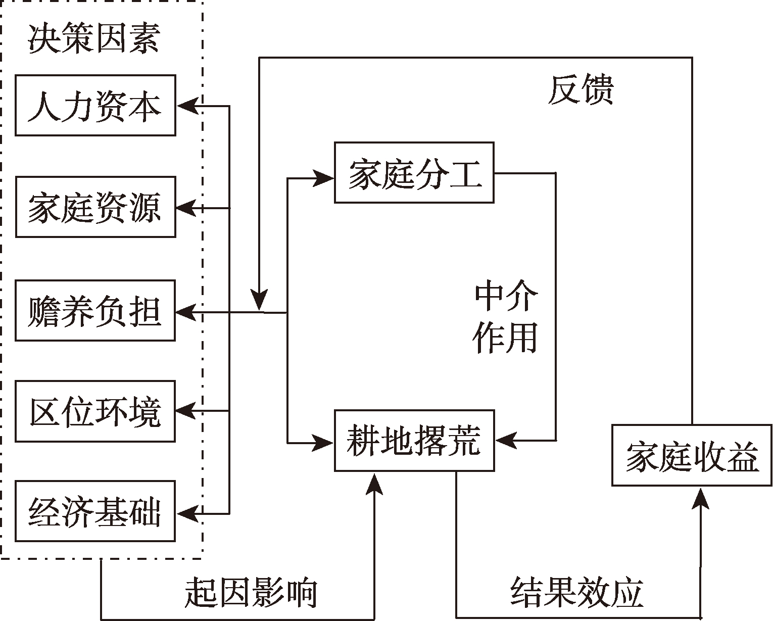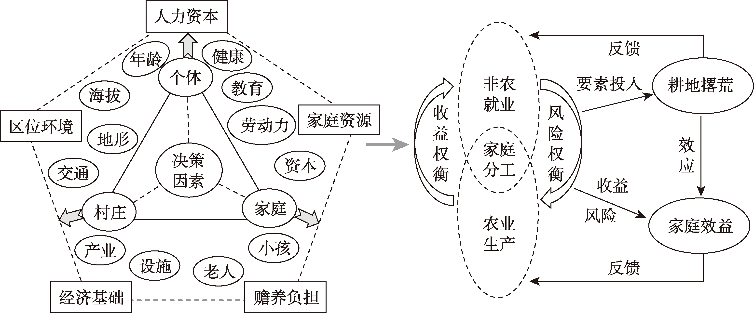 | 分维度 | 人力资本 | 家庭资源 | 赡养负担 | 自然区位 | 经济基础 | 家庭分工 | 耕地撂荒 | 家庭效益 |