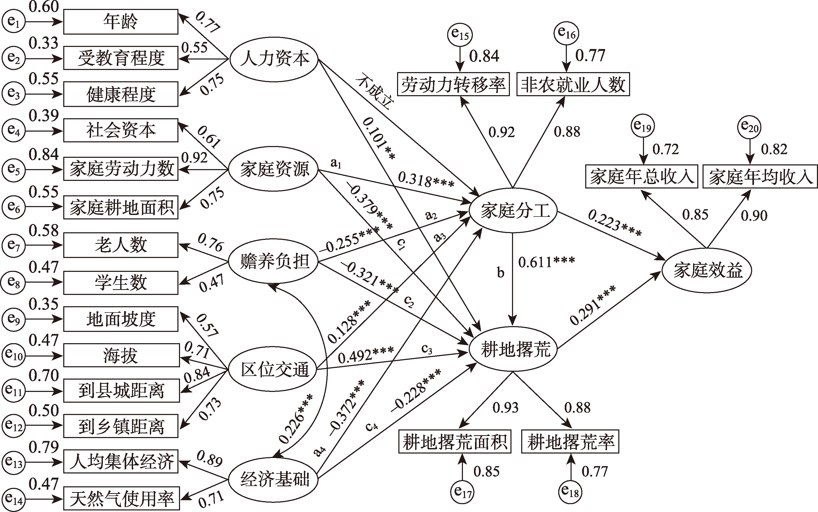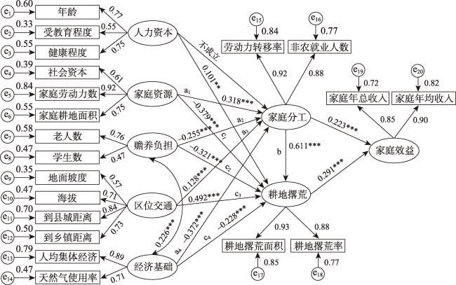 耕地撂荒现象作为山区经济发展中亟待解决的关键议题,不仅深刻关联着农户家庭生计模式的转型与资源优化配置,还直接牵动着粮食安全保障的稳固、农业现代化进程的加速以及乡村全面振兴的实现。基于此,本文以重庆市奉节县为研究区域,利用1970份农户实地调研数据,运用结构方程模型,分析农户耕地撂荒的影响机理及影响效应。结果表明:① 山区农户耕地撂荒是涉及家庭人力资源优化配置、经济收益综合考量、土地资源高效利用及风险规避等多方面因素综合作用的复杂现象,不仅是农户家庭内部经济结构对外界社会经济环境变化的适应性反应,也是农户为实现家庭效益最大化而作出的理性决策。② 家庭人力资本增强与村庄区位环境劣势的叠加影响,会显著促进耕地撂荒,而家庭资源丰富、赡养负担重以及村庄经济基础坚实则对农户撂荒决策具有显著的抑制作用。③ 家庭分工促进山区耕地撂荒,且其作为中介变量在影响耕地撂荒的多因素中扮演关键角色。为缓解山区耕地撂荒现象,要着重强化人力资本培养、改善区位环境势能、优化家庭分工结构、健全土地流转制度等策略,形成合力共同促进农村社会经济可持续发展。