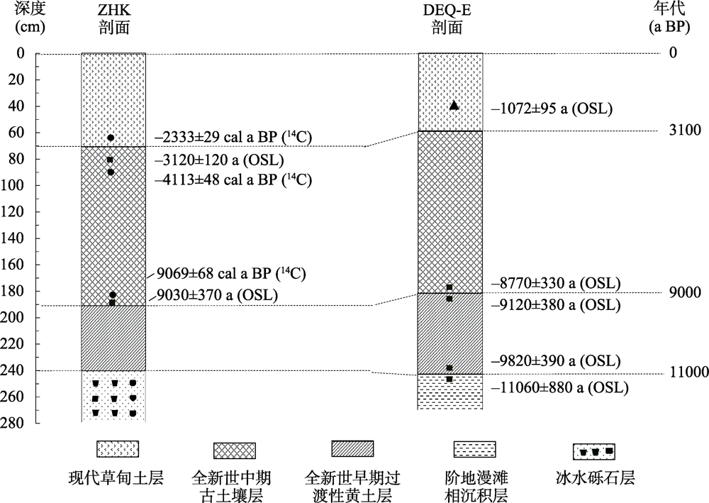 黄河源玛曲段达尔琼东(DEQ-E)与祖哈卡(ZHK)剖面地层年代框架对比