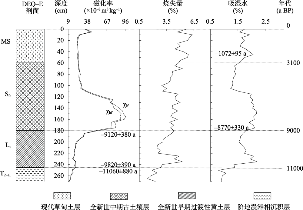 黄河源玛曲段达尔琼东(DEQ-E)剖面磁化率、烧失量和吸湿水含量变化曲线图