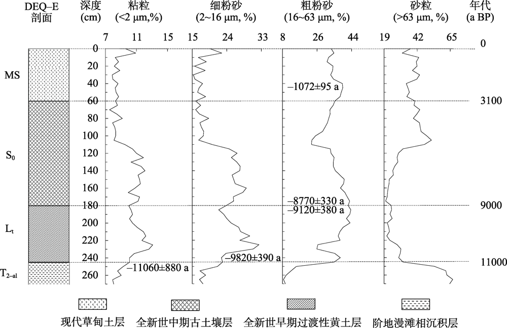 黄河源玛曲段达尔琼东(DEQ-E)剖面沉积物粒度成分变化曲线图