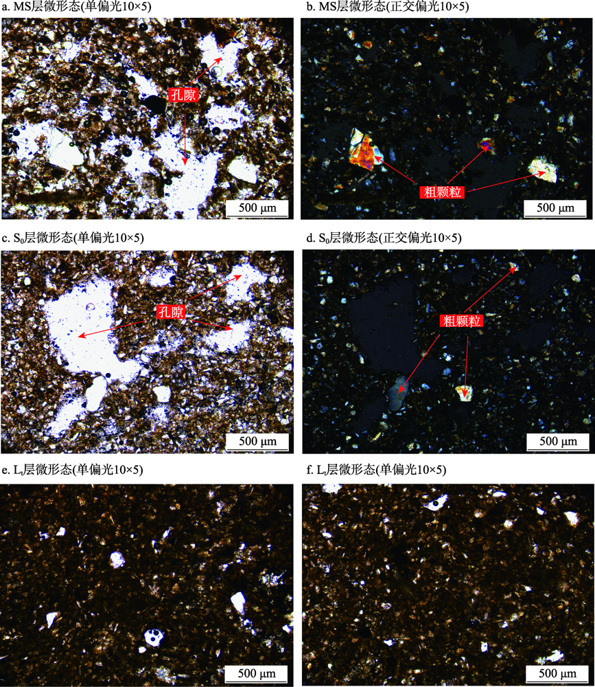 注:a(单偏光)和b(同一区域正交偏光)指示现代草甸土层(MS),采样深度55~60 cm;c(单偏光)和d(同一区域正交偏光)指示全新世中期古土壤层(S