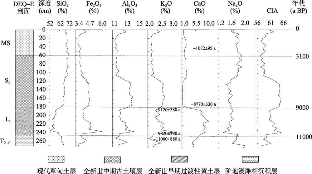 黄河源玛曲段达尔琼东(DEQ-E)剖面常量元素含量和CIA值变化曲线图