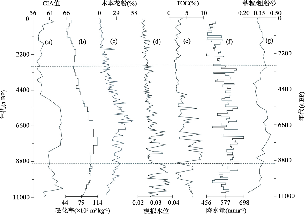 注:(a) 黄河源区玛曲段达尔琼东(DEQ-E)全新世黄土-古土壤剖面CIA值;(b) 青海湖地区风成沉积物剖面JXG-2磁化率值;(c) 达连海全新世木本植物花粉含量;(d) 青海湖模拟的平均湖泊水位;(e) 基于孢粉数据的若尔盖降水集成序列;(f) 青海湖TOC含量;(g) 黄河源玛曲段祖哈卡(ZHK)全新世黄土-古土壤剖面粘粒/粗粉砂值。