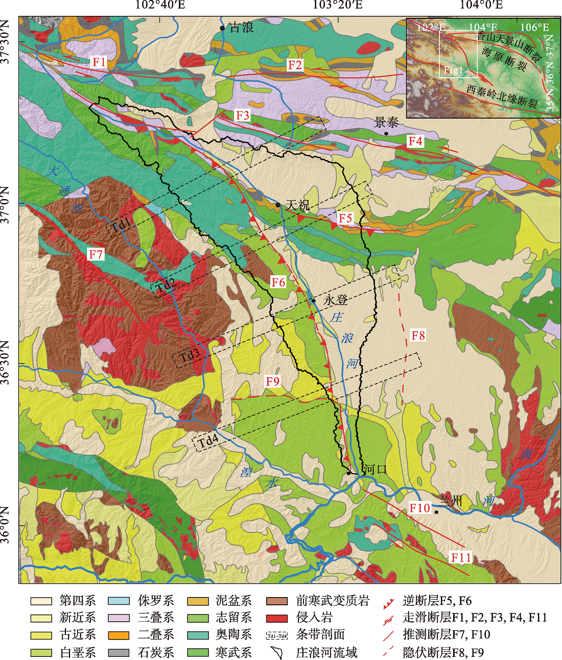 注:地质资料参考1:50万地质图(中国地质调查局: www.cgs.gov.cn, 2001),Td1~Td4为条带剖面,F1:冷龙岭断裂,F2:天桥沟-黄羊川断裂,F3:金强河-毛毛山-老虎山断裂,F4:老虎山断裂,F5:天祝盆地南缘断裂,F6:庄浪河断裂,F7:达坂山断裂,F8:秦王川盆地西缘隐伏断裂,F9:疙瘩沟隐伏断裂,F10:金城关断裂,F11:马衔山断裂。