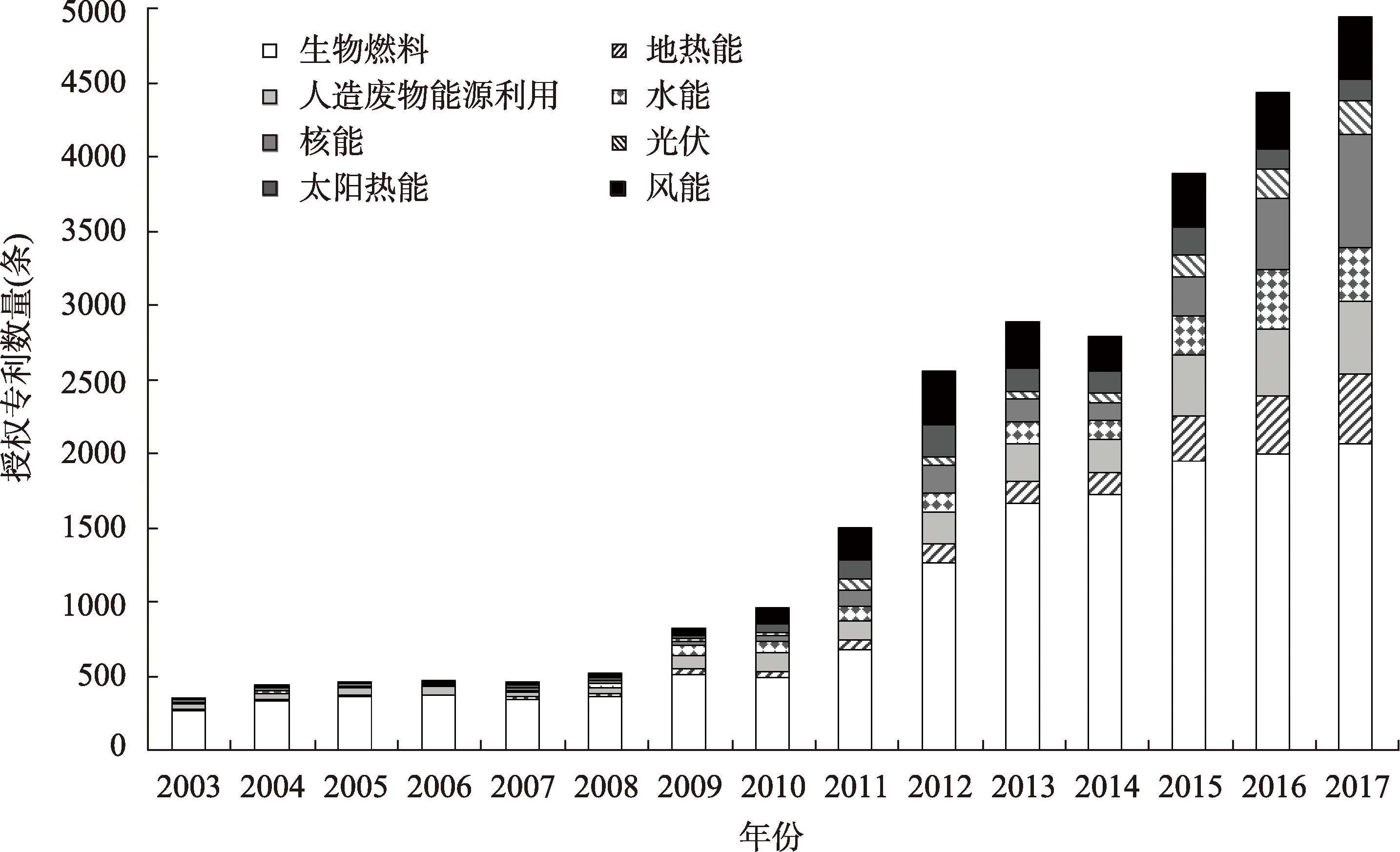 2003—2017年可再生能源技术专利数演变