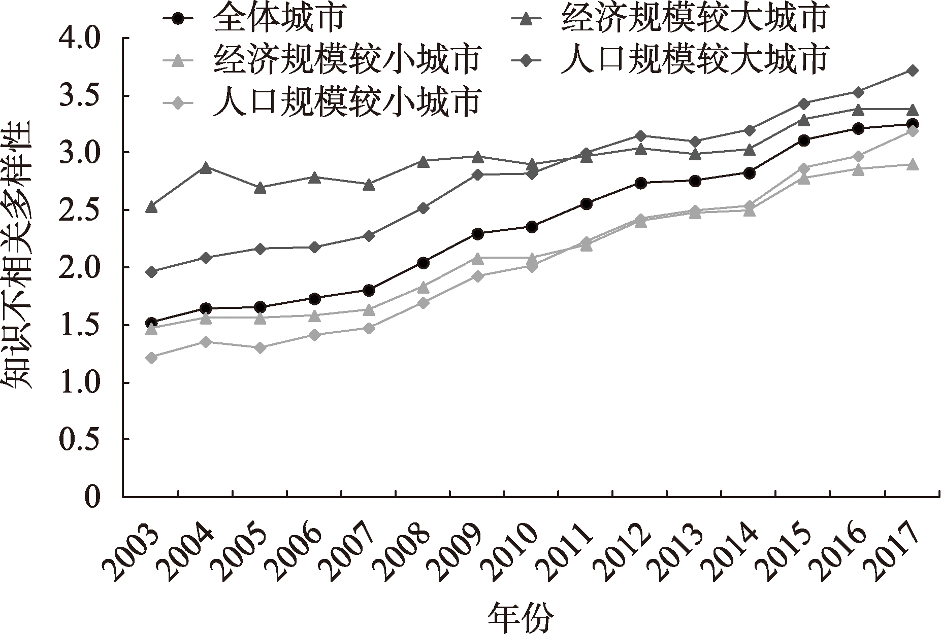 2003—2017年中国城市知识不相关多样性演变