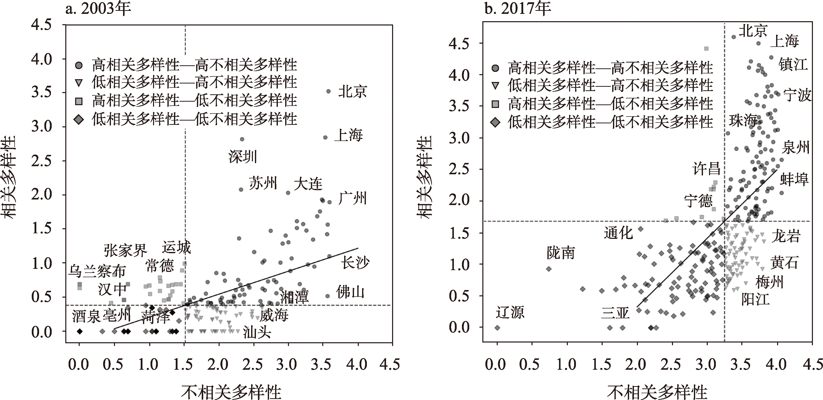 2003年和2017年中国城市知识相关多样性与不相关多样性散点图