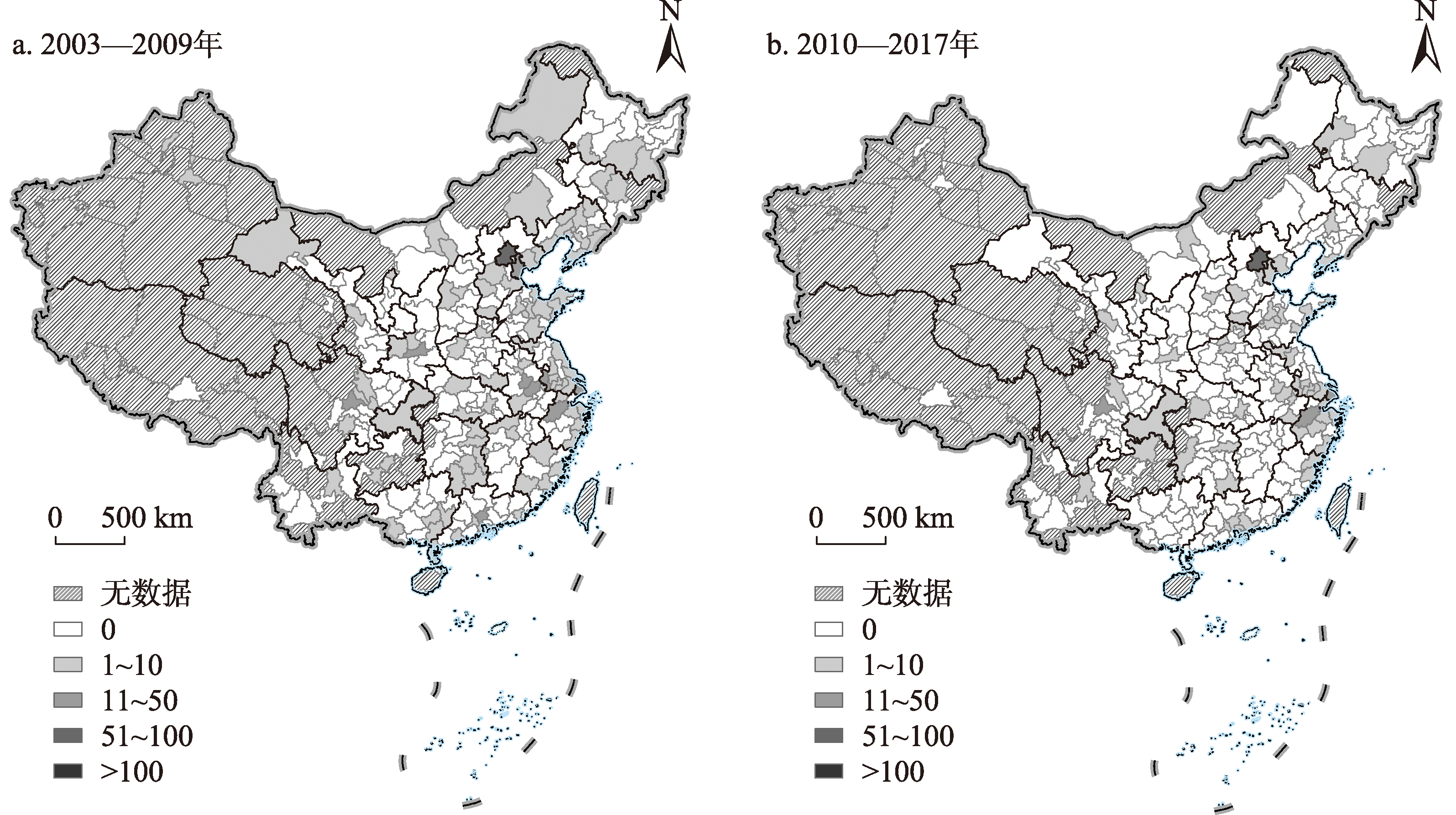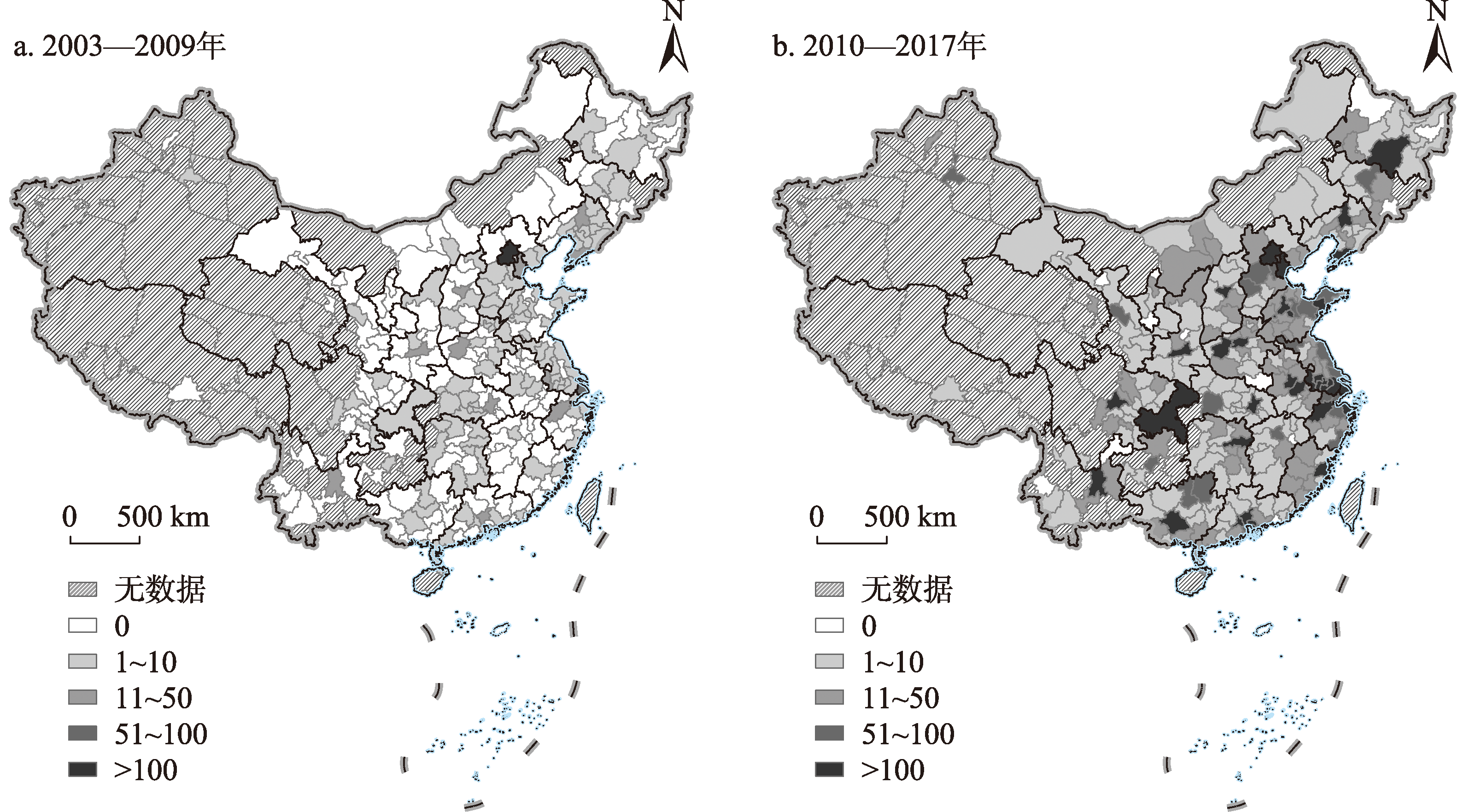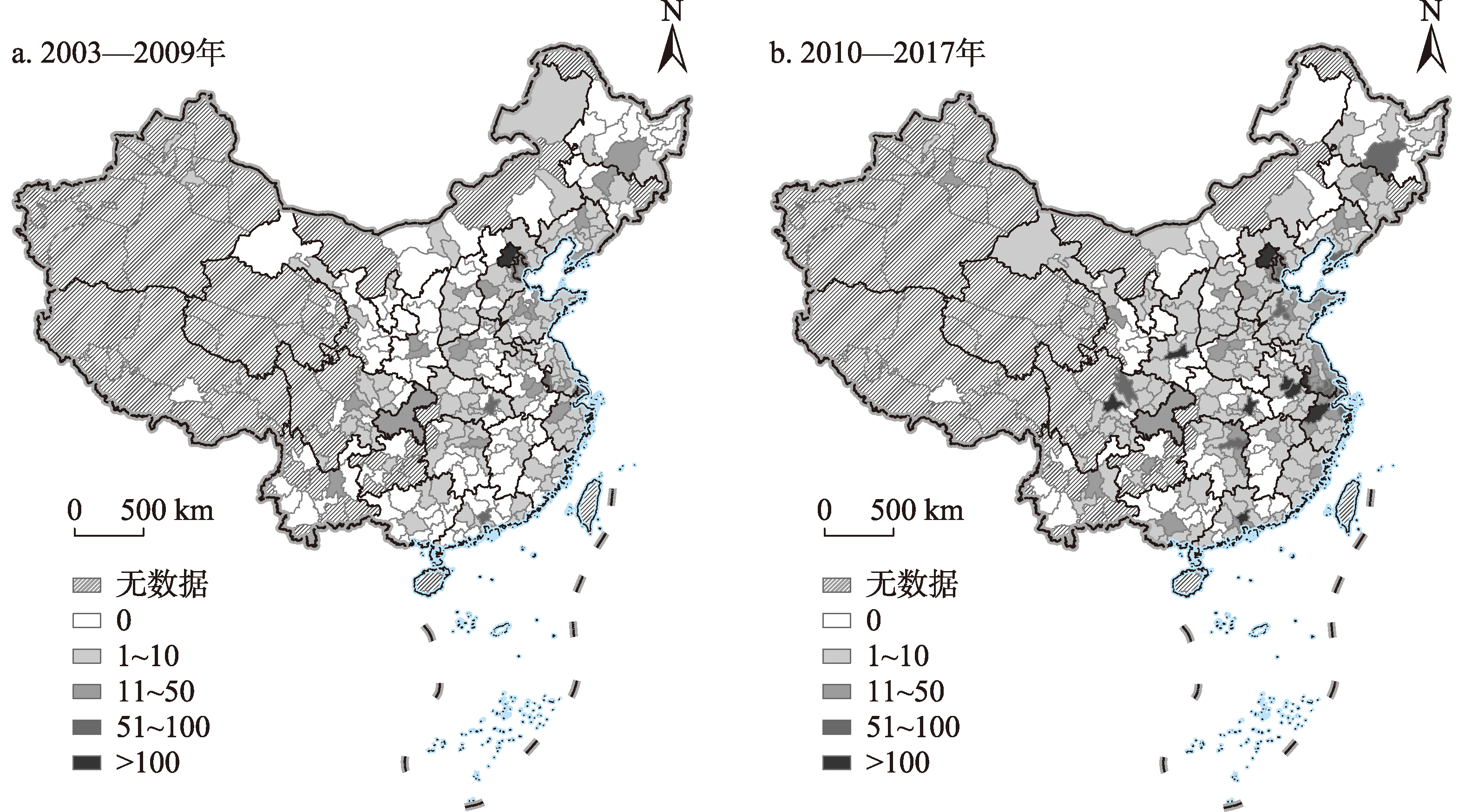 2003—2009年、2010—2017年中国城市初生阶段技术专利数量总和空间分布