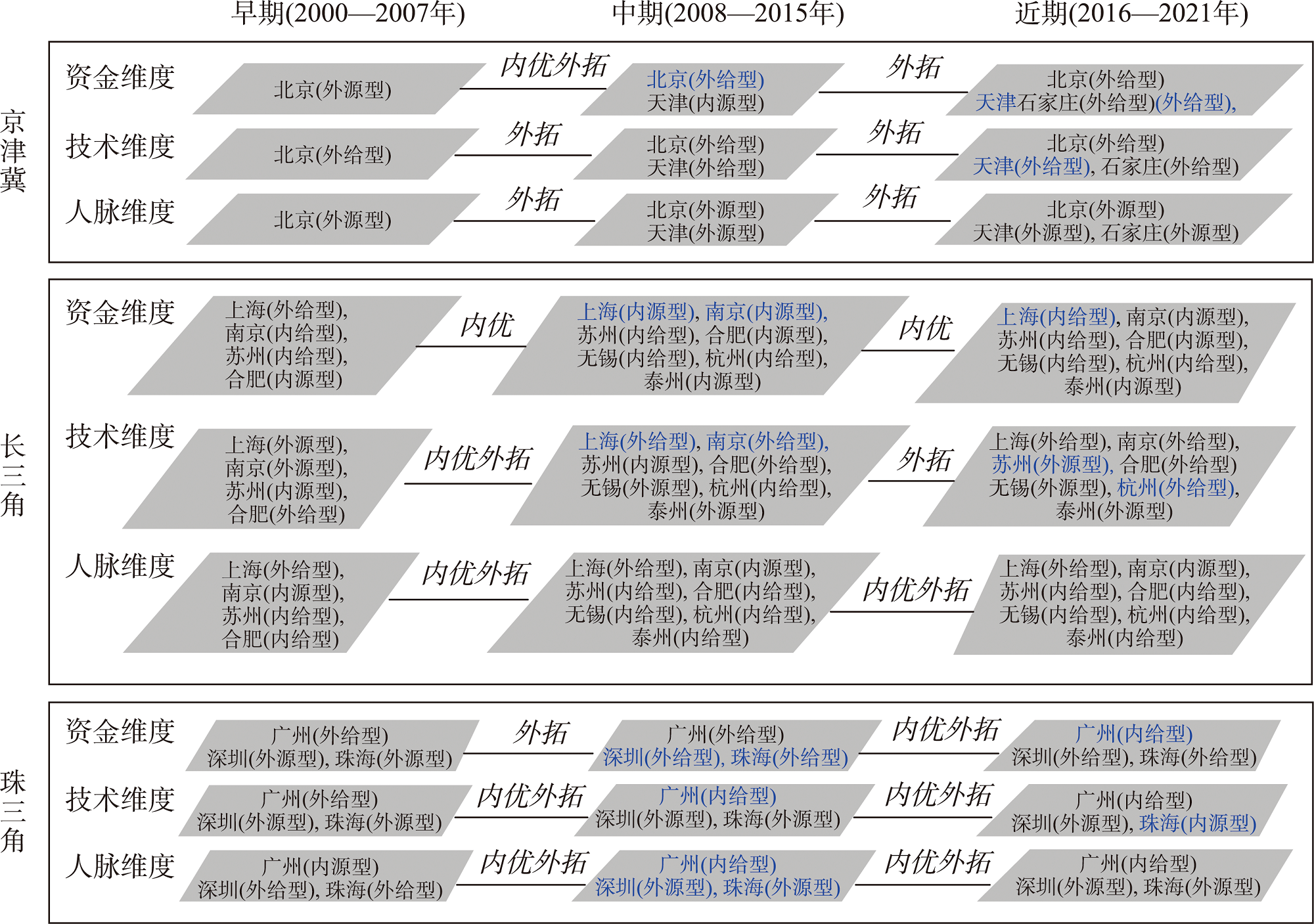 注:蓝色字体表示较上一阶段,该增长极类型发生了转变;“内优”即要素流沿城市群内部管道形成内给/源型增长极;“外拓”即要素流沿城市群外部管道形成外给/源型增长极。