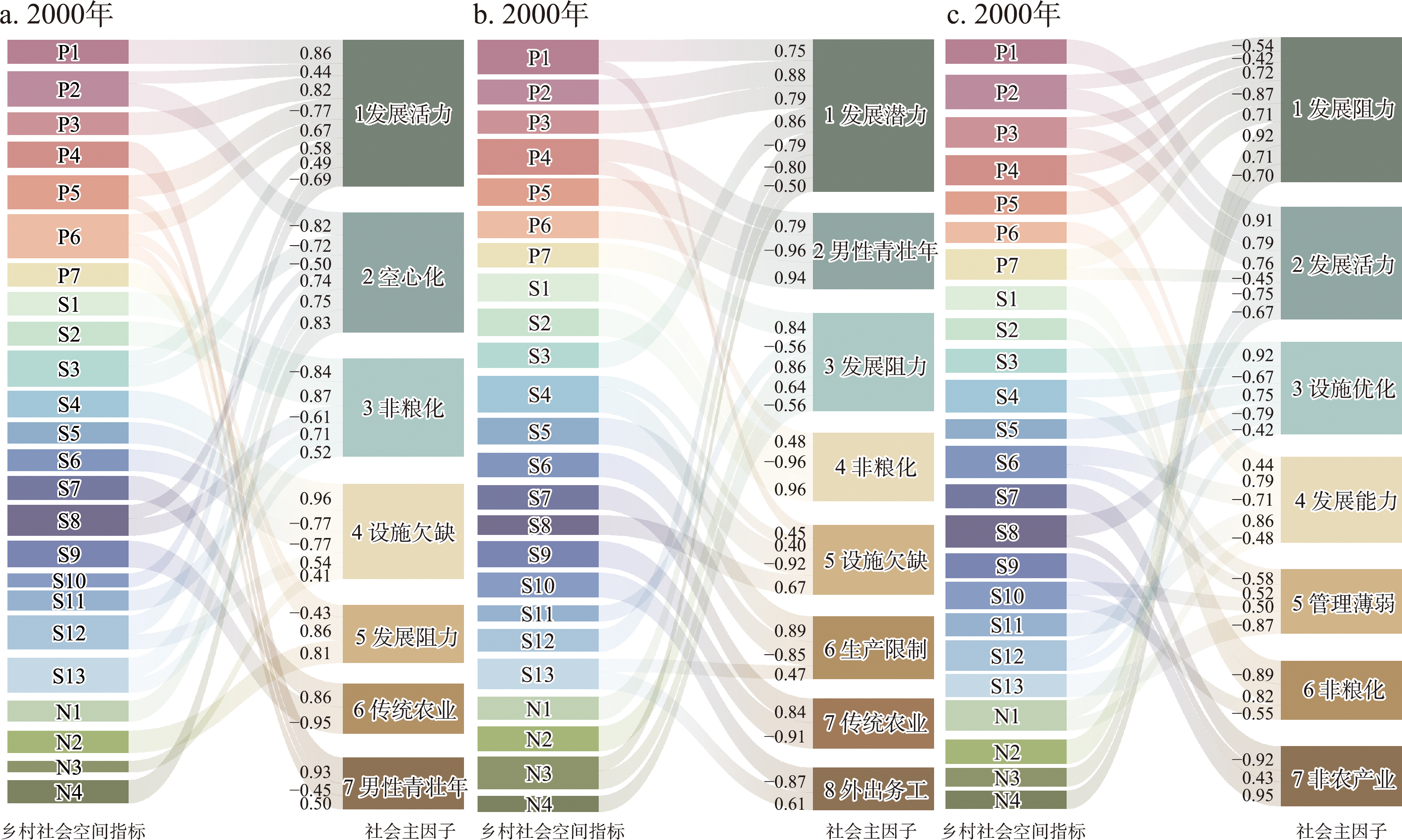 ,线的粗细代表各主因子对应指标的载荷值绝对值大小。
