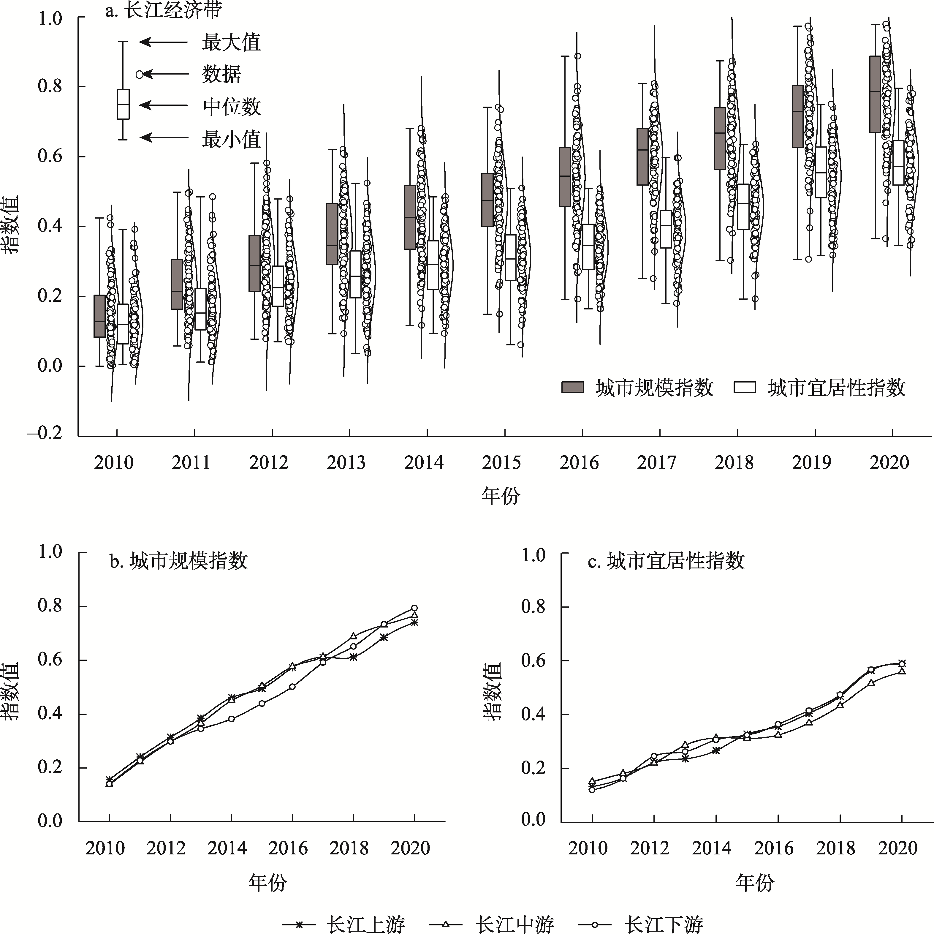 2010—2020年长江经济带城市规模与城市宜居性箱型图及各流域曲线分布