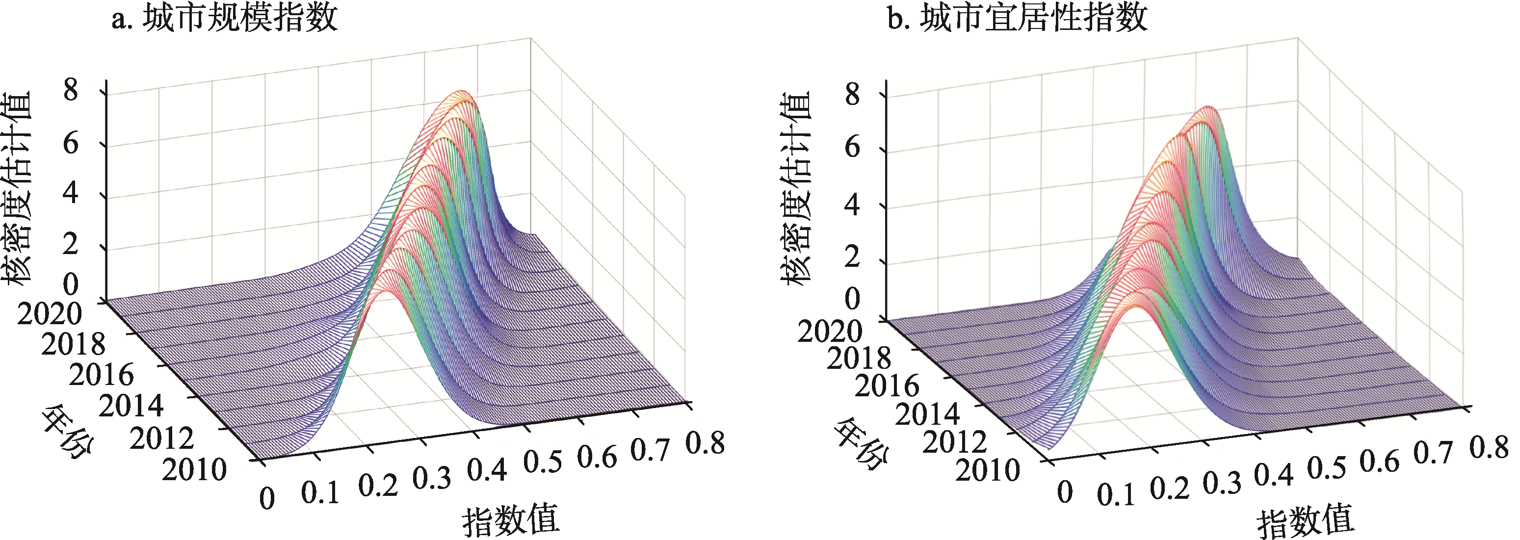 2010—2020年长江经济带城市规模与城市宜居性核密度估计值