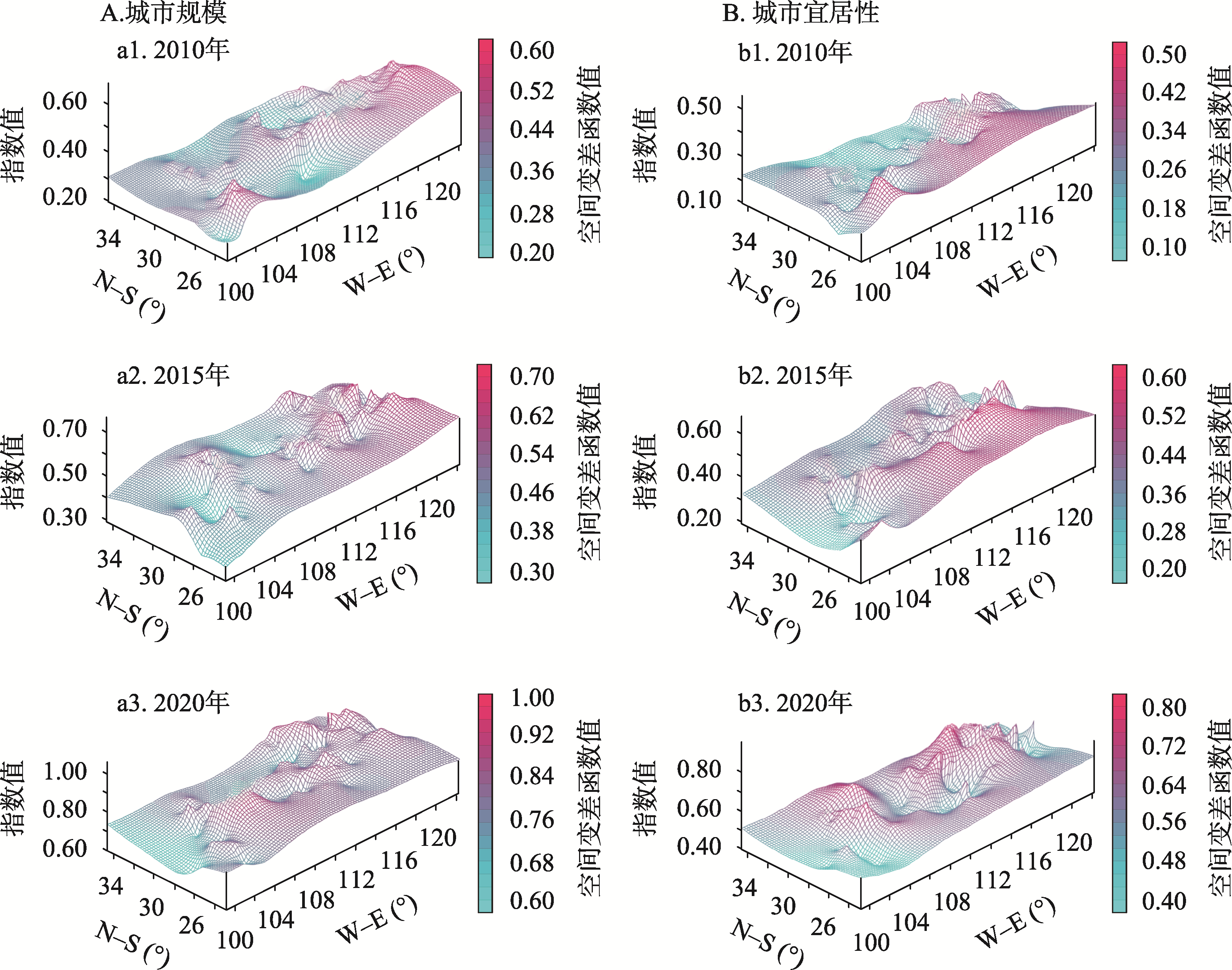 2010—2020年长江经济带城市规模与城市宜居性的克里金插值3D拟合分布