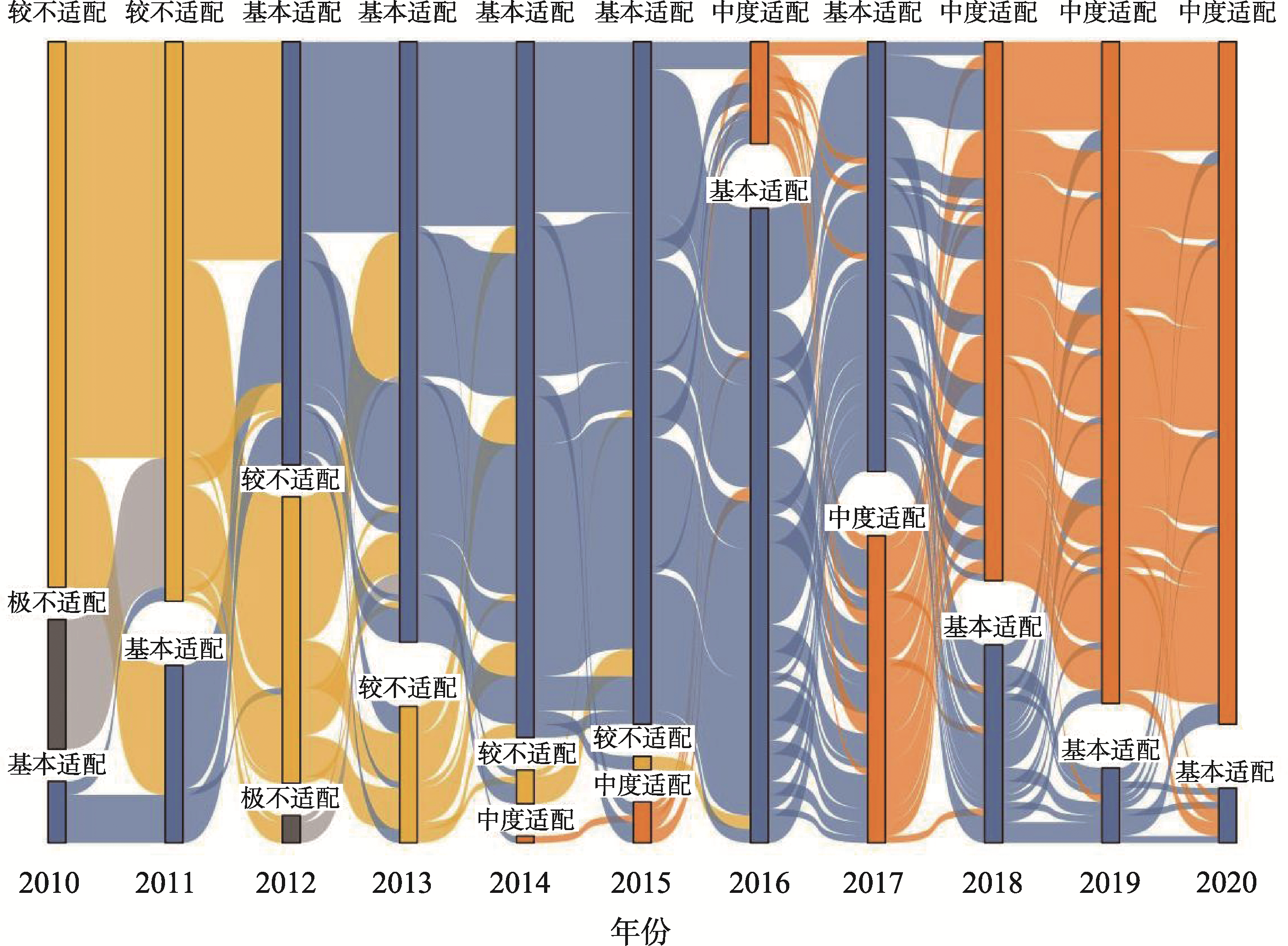 2010—2020年长江经济带城市规模与城市宜居性的适配类型演变