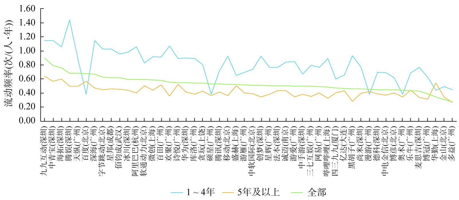 湾区游戏人才初次入职不同企业后的流动频率