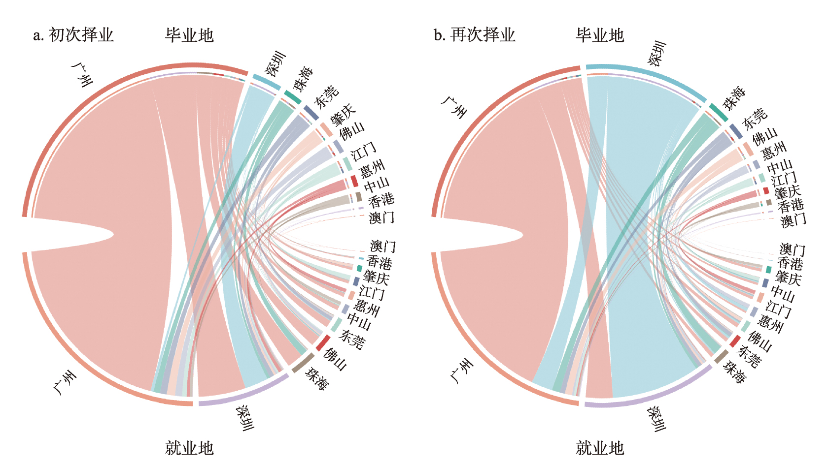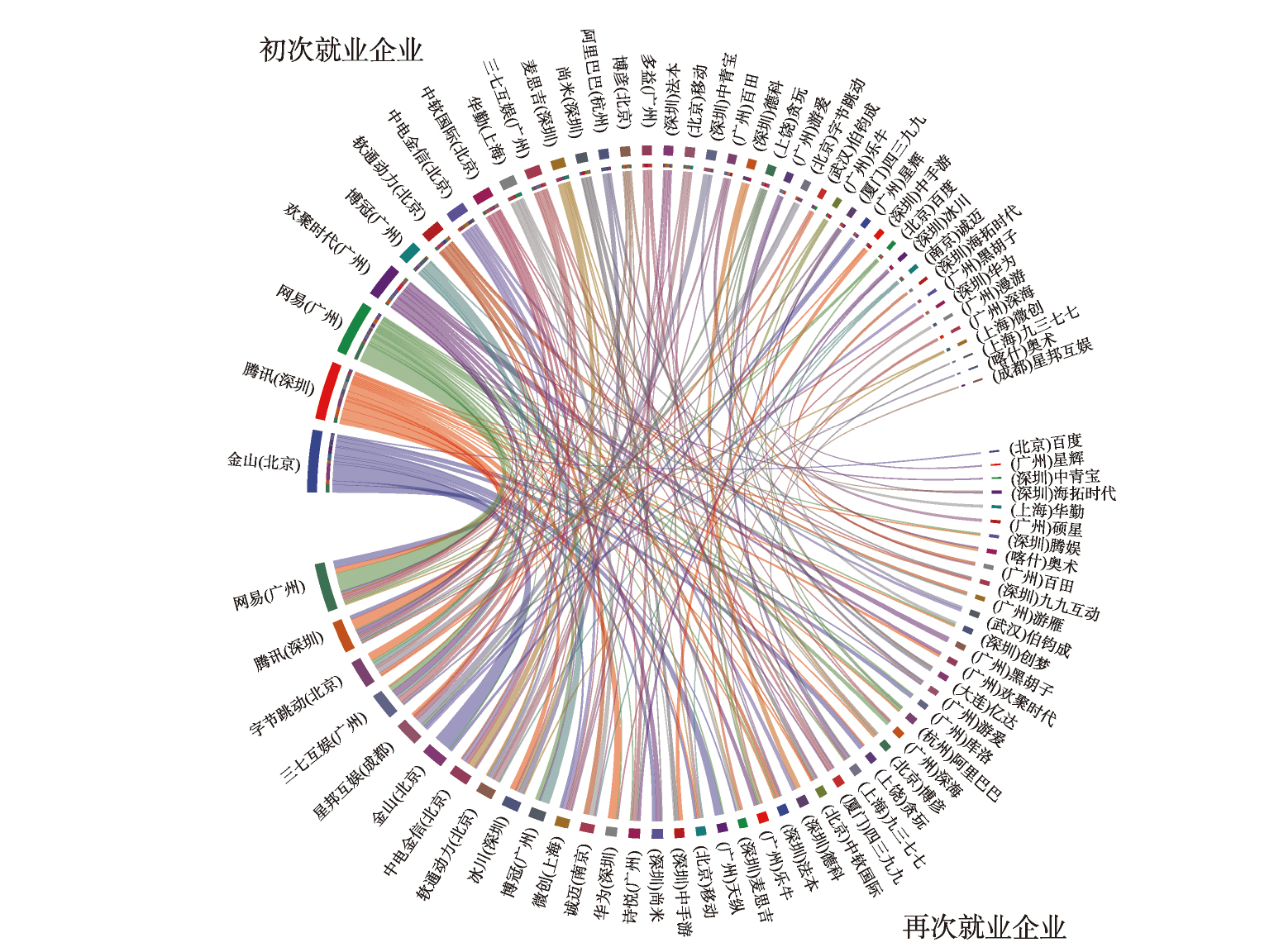 湾区各城市游戏人才初次就业的流动情况