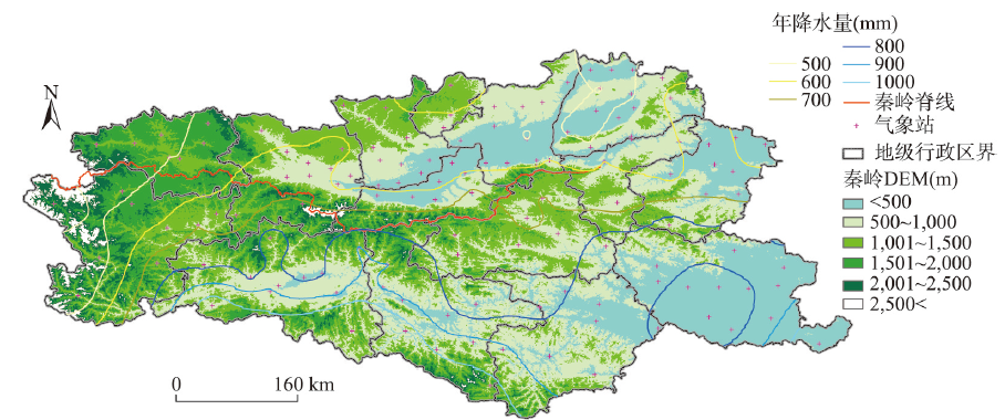 秦岭气象站、脊线和1981—2010年降水量等值线