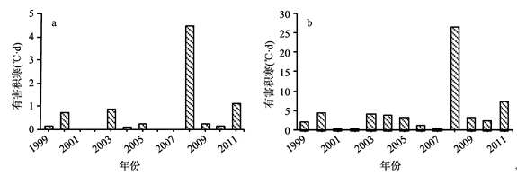 Fig. 1 Annual accumulated chilling in Haikou city for watermelon (a) and paprika (b)图1 海口市西瓜(a)和辣椒(b)有害积寒 |
