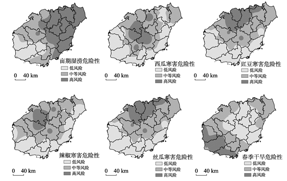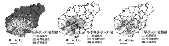Fig. 3 The zoning of damage environment sensibility for melon and vegetables in Hainan province图3 海南省瓜菜苗期湿涝、冬季寒害、春季干旱孕灾环境敏感性 |