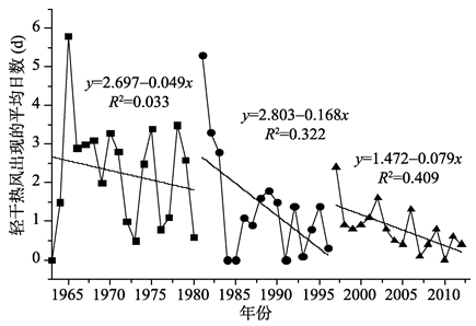 Fig. 2 Changes of annual average days of light dry-hot wind图2 轻度干热风发生平均日数变化曲线 |