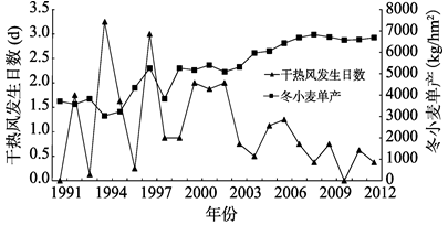 Fig. 4 The relationship of the number of dry-hot wind days and yield of winter wheat图4 干热风发生日数与冬小麦单产的相关关系 |