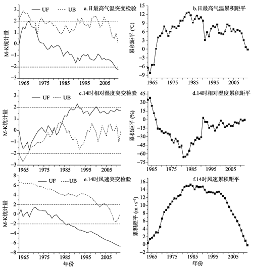 Fig.1 Mutation test and cumulative departure of daily maximum temperature, relative humidity at 14:00 and wind speed at 14:00图1 日最高气温、14时相对湿度、14时风速的突变检验及累积距平曲线 |