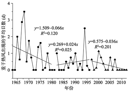 Fig. 3 Changes of annual average days of severe dry-hot wind图3 重度干热风发生平均日数变化曲线 |