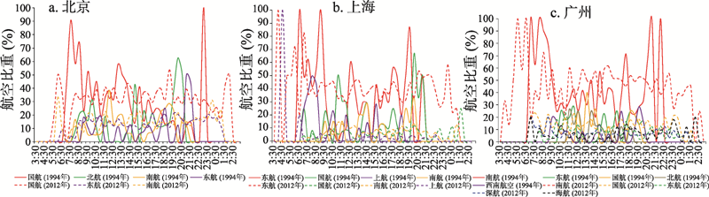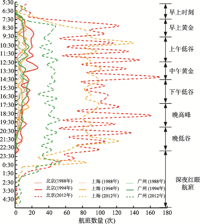 Fig. 3 Temporal structure at Beijing, Shanghai and Guangzhou airports in 1988, 1994 and 2012图3 1988年、1994年和2012年北京、上海和广州航班时刻结构 |