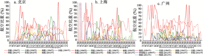 Fig. 4 Temporal structure of main airlines at Beijing, Shanghai and Guangzhou in 1994 and 2012图4 1994和2012年航空公司在北京、上海和广州的航空比重 |
