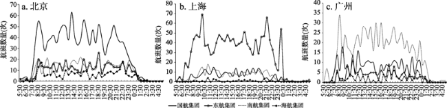Fig. 5 Schedule structure of four aviation groups at Beijing, Shanghai and Guangzhou airports图5 四大航空集团在北京、上海、广州的航班时刻资源 |