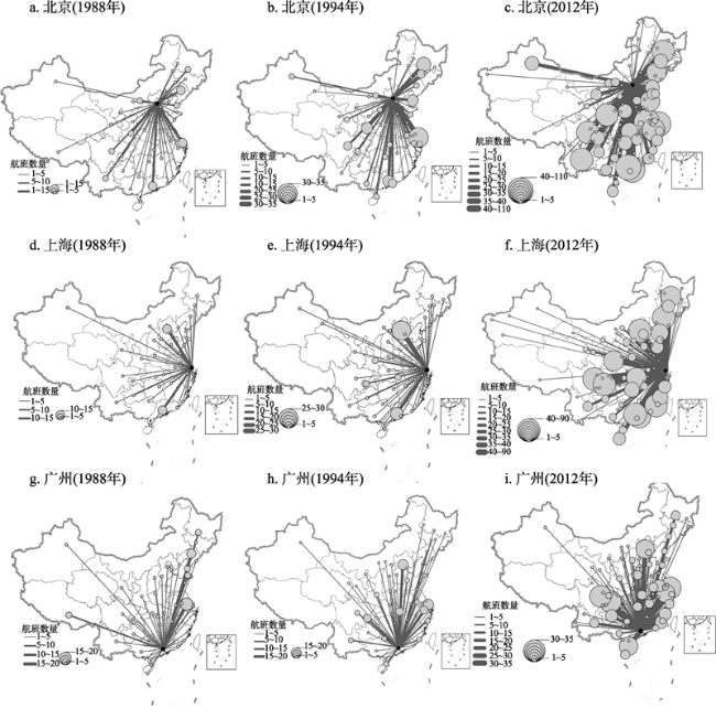 Fig. 6 Flights at Beijing, Shanghai, Guangzhou airports in 1988, 1994 and 2012图6 1988年、1994年、2012年北京、上海、广州的航班联系 |