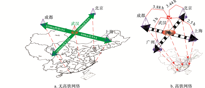 Fig. 2 Changes of the accessibility from Wuhan to Beijing, Shanghai, Guangzhou and Chengdu in the network of HSR图2 高铁网络下武汉到北京,上海,广州和成都四大城市的可达性变化示意图 |