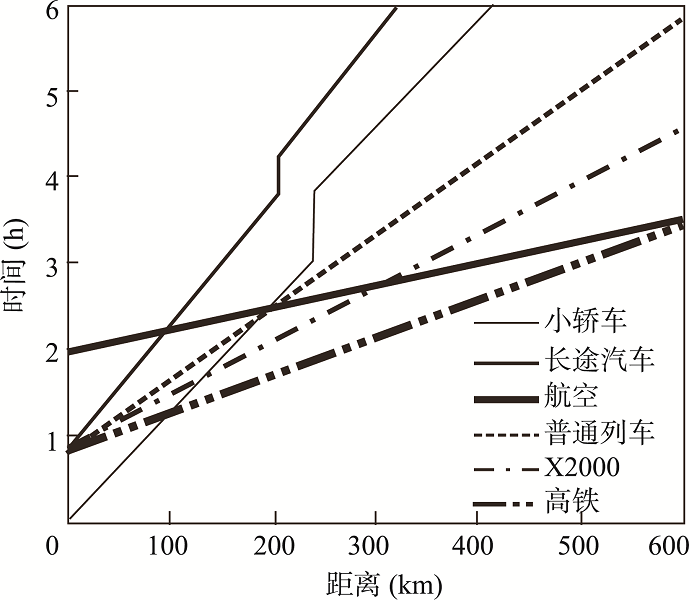 Fig. 3 Comparison of different traffic modes in travelling time图3 各交通系统旅行距离用时比较注:根据Oskar[18]整理. |