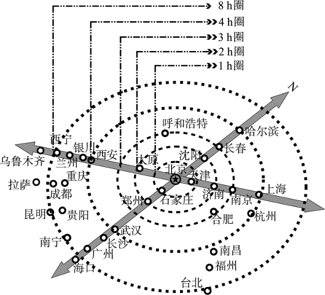 Fig. 1 Distribution of the provincial capital city in Beijing's isochronous rings of HSR图1 省会城市在北京高铁等时圈分布 |