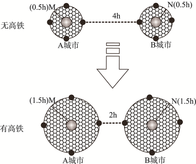 Fig. 4 Comparison of internal time distance between inside the city and inter cities before and after HSR图4 有无高铁城市间和城市内部时间距离比较注:根据王昊等[20]整理. |