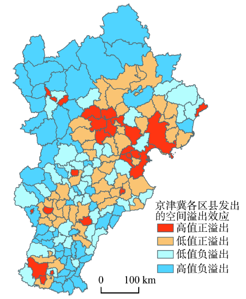 Fig. 1 Spatial pattern of emitted spillover effects in Beijing-Tianjin-Hebei region at county level图1 京津冀各县域发出的溢出效应空间格局 |