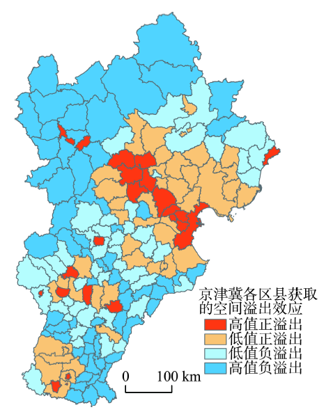 Fig. 2 Spatial pattern of acquired spillover effects in Beijing-Tianjin-Hebei region at county level图2 京津冀各县域获取的溢出效应空间格局 |