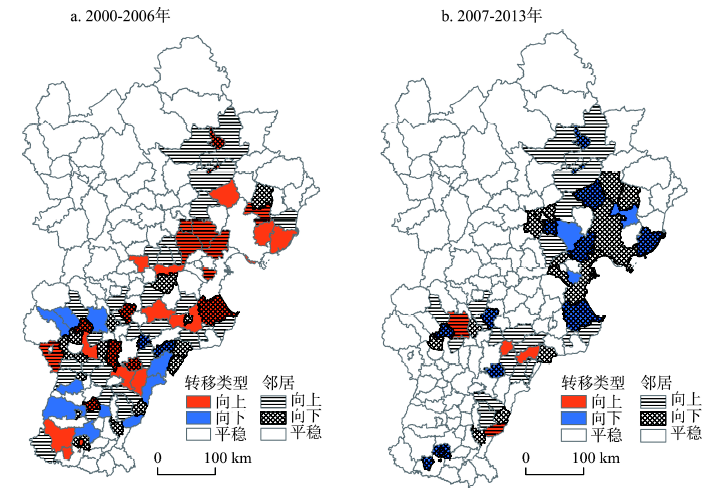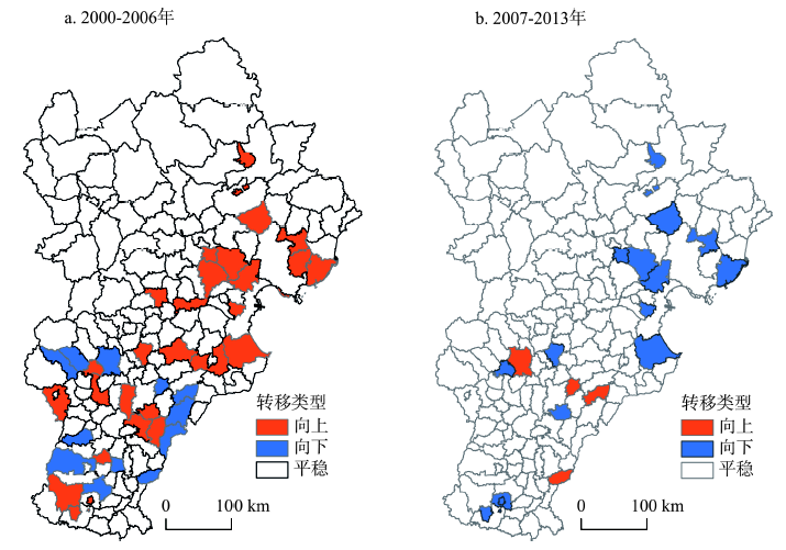 Fig. 3 Spatial patterns of economic level types transitions at county level in Beijing-Tianjin-Hebei region, 2000-2013图3 2000-2013年京津冀县域经济水平类型转移的空间分布格局 |