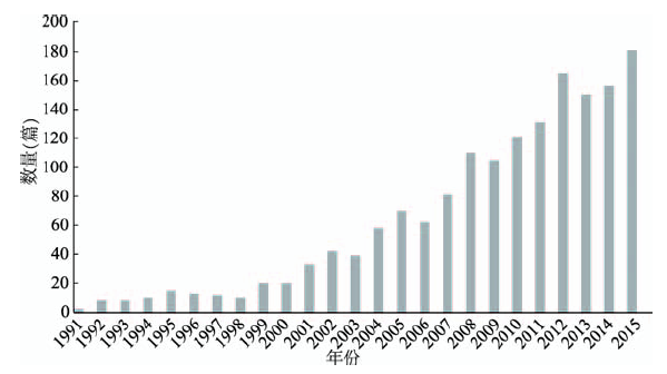 Fig. 1 Annual trend of articles of innovation geography research during 1991-2015图1 1991-2015年创新地理研究文章篇数 |