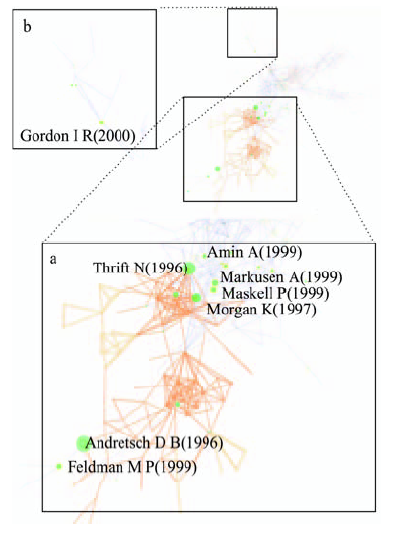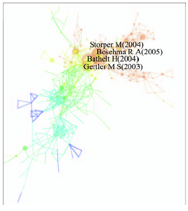 Fig. 8 The co-citing articles networks of innovation geography research during 2006-2015图8 2006-2015年创新地理研究网络示意图 |