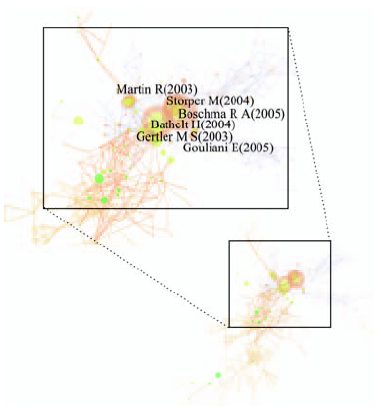 Fig. 7 The co-citing articles networks of innovation geography research during 2001-2005图7 2001-2005年创新地理研究网络示意图 |