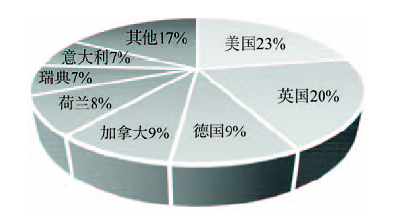 Fig. 2 The countries of innovation geography researchers during 1991-2015图2 1991-2015年作者所在国家分布图 |