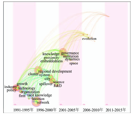 Fig. 3 The keywords evolution of innovation geography research during 1991-2015图3 1991-2015年西方创新地理研究的关键词演化图 |