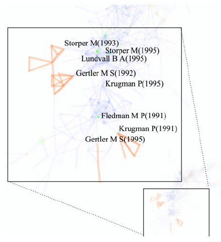 Fig. 6 The co-citing articles networks of innovation geography research during 1996-2000图6 1996-2000年创新地理研究网络示意图 |