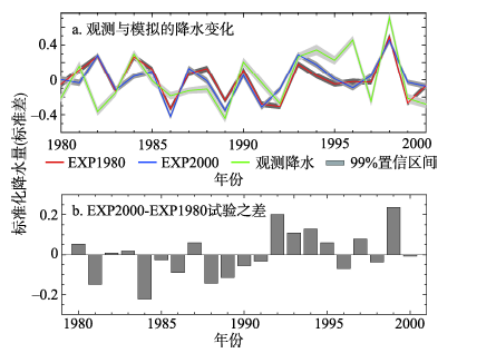 Fig. 3 Ground measurements and WRF simulations of summer precipitation variations from 1980 to 2000图3 观测及WRF模拟的1980-2000年中国东部(105°E以东)夏季降水变化 |