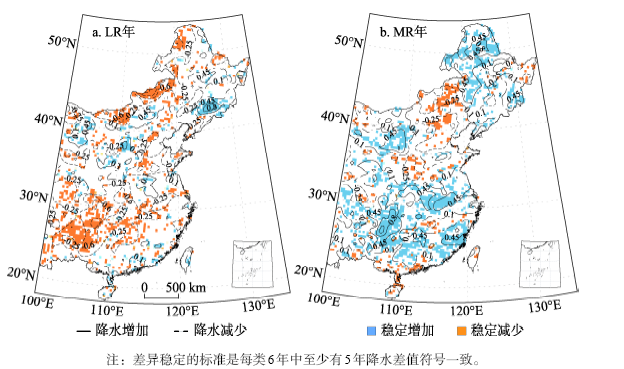 图4 LR年和MR年平均的EXP2000与EXP1980降水之差(EXP2000-EXP1980)Fig. 4 Mean differences of precipitation between the two simulations (EXP2000 minus EXP1980)for the LR years and MR years |