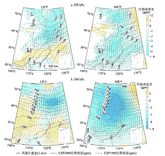 Fig. 5 Mean differences of geopotential height and wind field between the two simulations (EXP2000 minus EXP1980)for the LR years and MR years图5 LR年和MR年平均的EXP2000与EXP1980位势高度场之差及风场之差(EXP2000-EXP1980) |